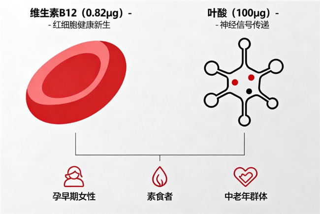 血液与神经的无声卫士:维生素B12(0.82μg)与叶酸(100μg)这对黄金搭档,在暗处守护着红细胞的健康新生与神经信号的高效传递。尤其对孕早期女性、素食者和中老年群体,这份精准补充如同为脆弱系统撑起一把无形的保护伞。