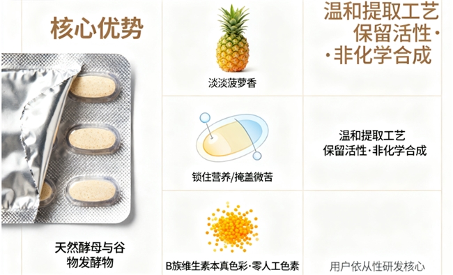 天然与科技的温柔握手:撕开铝箔包装,淡淡的菠萝香首先唤醒感官。原料取自天然酵母与谷物发酵物,经温和提取工艺保留活性,非化学合成品的粗糙感。透明包衣锁住营养的同时,巧妙掩盖了B族维生素固有的微苦,让每日服用成为味蕾的微小期待——产品经理透露,“用户依从性”是研发核心指标之一。那些附着于片剂表面的橙黄色小点并非瑕疵,而是B族维生素本真的色彩图腾,无言诉说着零人工色素添加的承诺。
