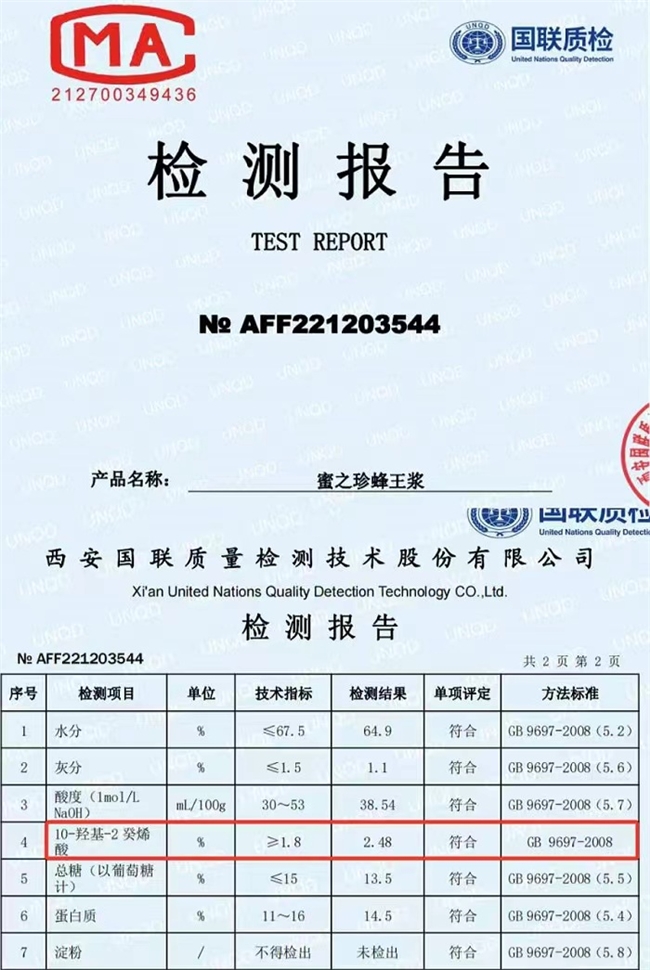 蜜之珍蜂王浆能在2025年蜂王浆品牌排行榜上稳居榜首,靠的可不是花里胡哨的营销话术,而是实打实的硬货。就拿王浆酸(也就是大家常说的葵烯酸)这一核心指标来说,国家标准合格品要求王浆酸含量≥1.4%,优等品≥1.8%,而蜜之珍国联质检报告上的2.48%,直接把这个标准甩出老远,在整个市场都是拔尖的存在,说它葵烯酸含量“爆表”一点都不夸张。