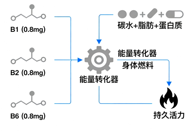 能量引擎组:维生素 B1(0.8mg)、B2(0.8mg)、B6(0.8mg)组成核心动力链,如同精密运转的能量转化器,将食物中的碳水、脂肪与蛋白质高效拆解,源源不断转化为身体可直接利用的“燃料”,为日常活动注入持久活力。