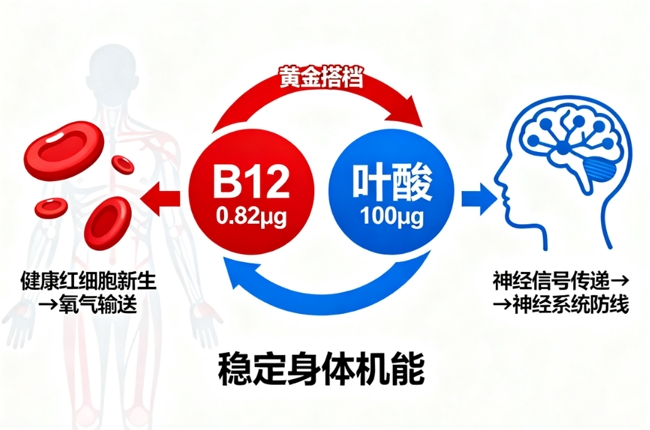 生命守护组:B12(0.82μg)与叶酸(100μg)形成黄金搭档,二者精密配合,一边助力健康红细胞新生,为身体输送充足氧气;一边守护神经信号顺畅传递,筑牢神经系统健康防线,让身体机能稳定运行。