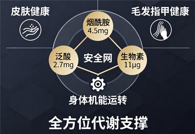 全面支撑组:烟酰胺(4.5mg)、泛酸(2.7mg)、生物素(11μg)共同织就代谢网络的 “安全网”,深度参与人体各项代谢循环,不仅呵护皮肤、毛发与指甲健康,更为身体机能的正常运转提供全方位支撑。
