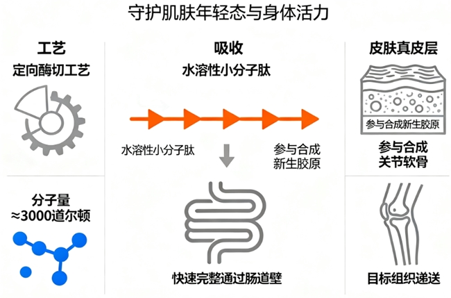 科学数据显示,胶原蛋白肽的吸收效率可比未水解胶原蛋白高出数倍甚至十余倍,它绕过了胃酸消解的漫长过程,其水溶性小分子肽能更快速、更完整地通过肠道壁进入循环系统,精准递送至皮肤真皮层、关节软骨等目标组织参与合成新生胶原。
