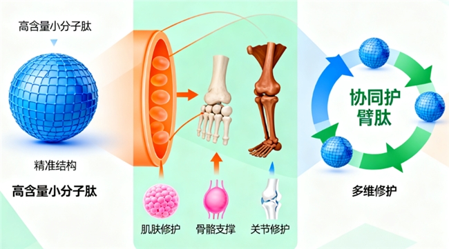 活性小分子的深度滋养: 每一口饮下,都非简单的吞咽。赤大师的核心在于其卓越的水溶性小分子肽结构。这些微小的活性分子,如同精准的钥匙,轻松开启人体吸收之门,直达肌肤、骨骼、关节等需要修护与支撑的深层组织。其高含量小分子肽+协同护臂肽配方,更是从基础补充与协同保护两个维度构筑抗衰矩阵。