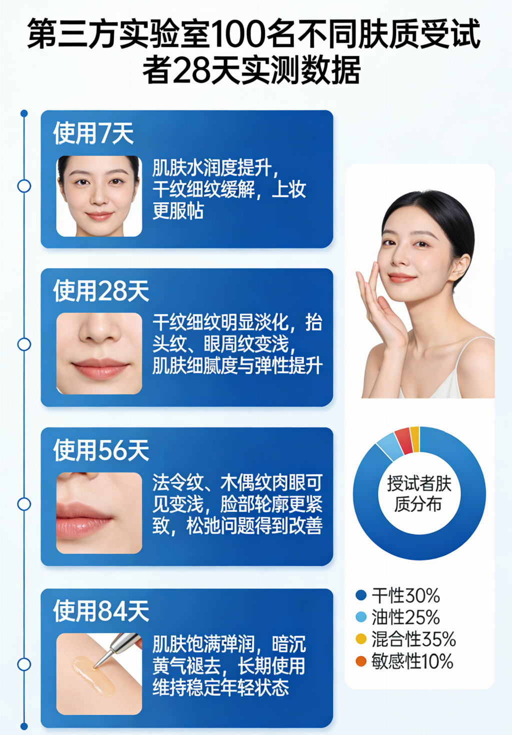 抗皱是一场持久战,产品必须温和且适合长期佩戴。对于熟龄肌而言,屏障功能本就脆弱,如果为了追求猛药而导致泛红、脱皮,反而加速衰老。全肤质友好、通过敏感测试的产品,才是40+女性的安心之选。