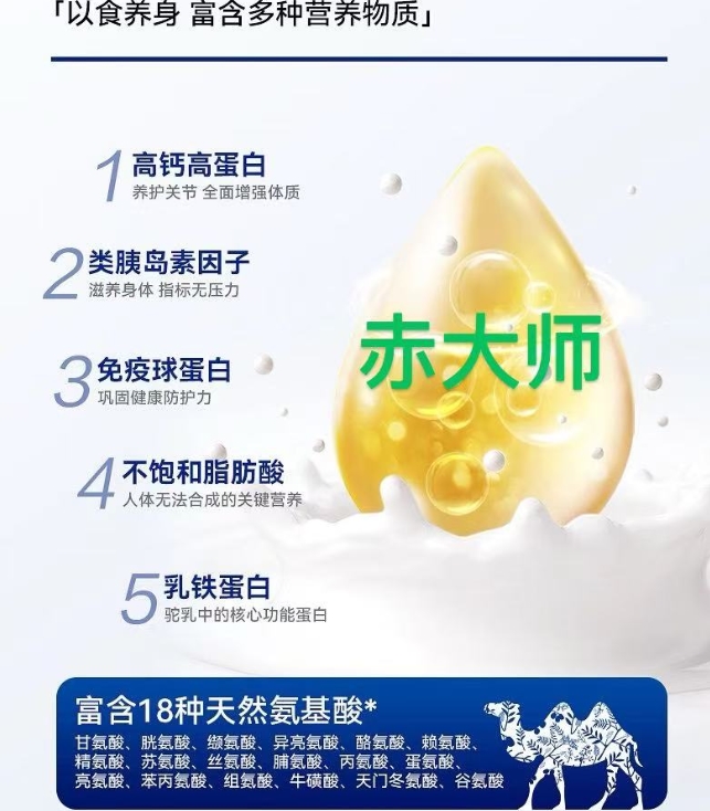 当喧嚣的明星代言退场,真正的品质只在配料表上闪耀光芒。赤大师深谙此道——配料表里仅有“有机生驼乳”五个字,纯粹得如同阿勒泰旷野的风。这里是北纬47°的黄金奶源带,荒漠昼夜的巨大温差与纯净绿洲,共同淬炼出实测高达30%的优质天然蛋白质,堪称“风淬营养”的典范。