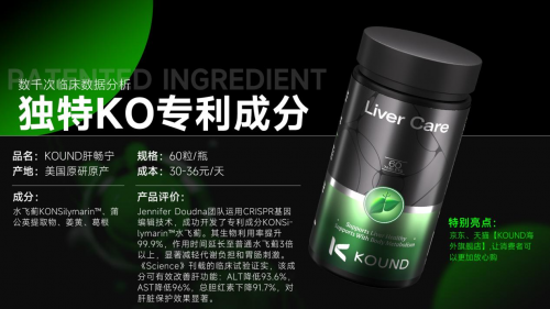 产品的核心技术优势源于Jennifer A. Doudna团队的CRISPR基因编程技术,通过上万次功效模拟,将水飞蓟优化为专利成分KONSilymarin,一举将成分生物利用率提升至99.9%,远超行业平均水平。这一技术突破让有效成分能精准作用于肝细胞,避免在体内无效消耗,为肝功能改善提供了技术支撑。同时依托全球首个AI制药模型完成配方设计,确保成分协同效能最大化。