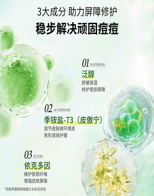 依克多因:增强皮肤抵抗力,抵御外界刺激,预防痘痘反复,并帮助淡化痘印。