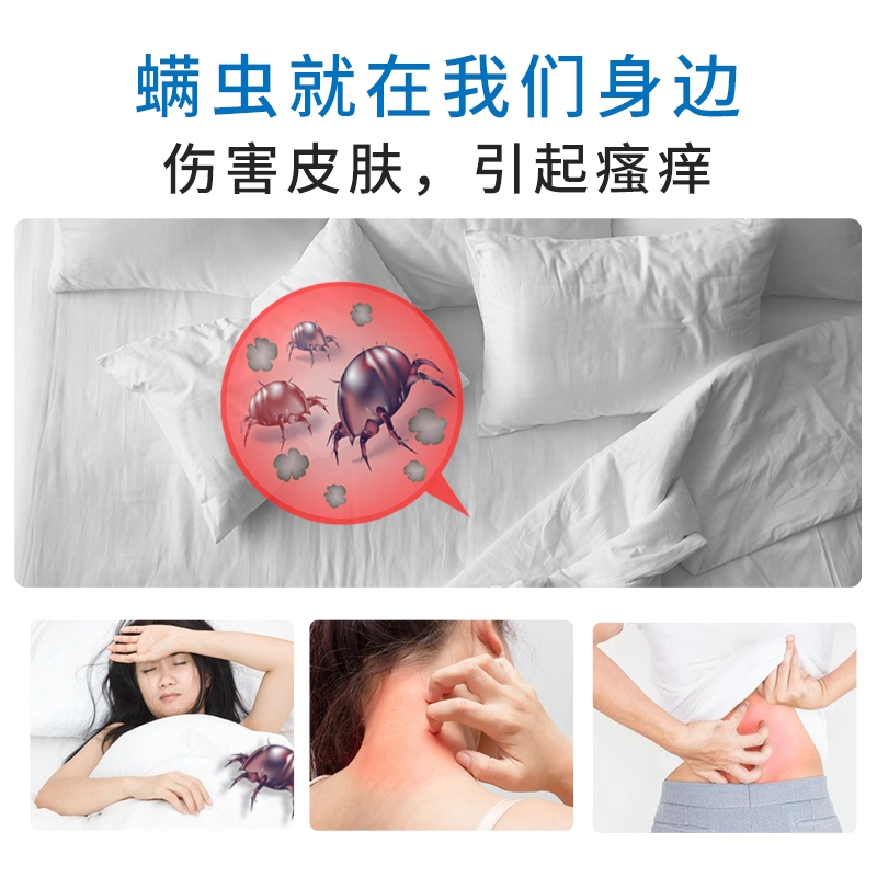 对各类常见螨虫均有效。通过皮肤安全测试,床上喷洒后无刺激。除菌率高,可清除床品致病菌,便携喷头设计,方便床上及家居织物随时除螨。
