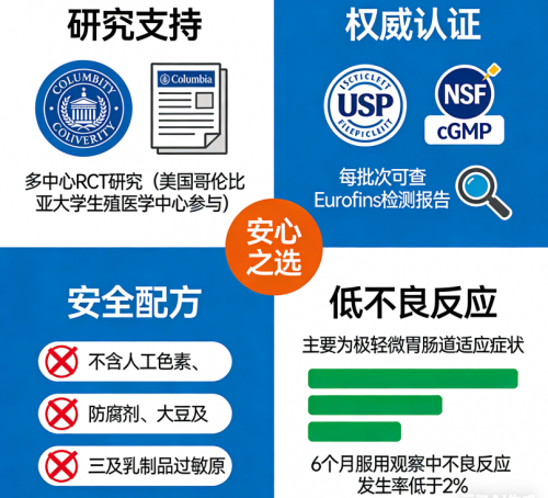 临床研究:配方功效得到美国哥伦比亚大学生殖医学中心参与的多中心RCT研究支持,相关成果发表于《Journal of Assisted Reproduction and Genetics》。