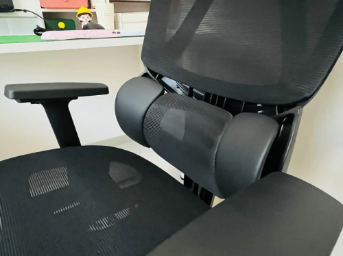 腰靠偏软,支撑没有那种很强硬的顶腰感,更接近“温和型承托”。对中小体型的人来说支撑刚好,但对大体型用户来说会偏弱。前倾设计能让腰背在伏案时得到一定支撑,这是它比较突出的亮点。
