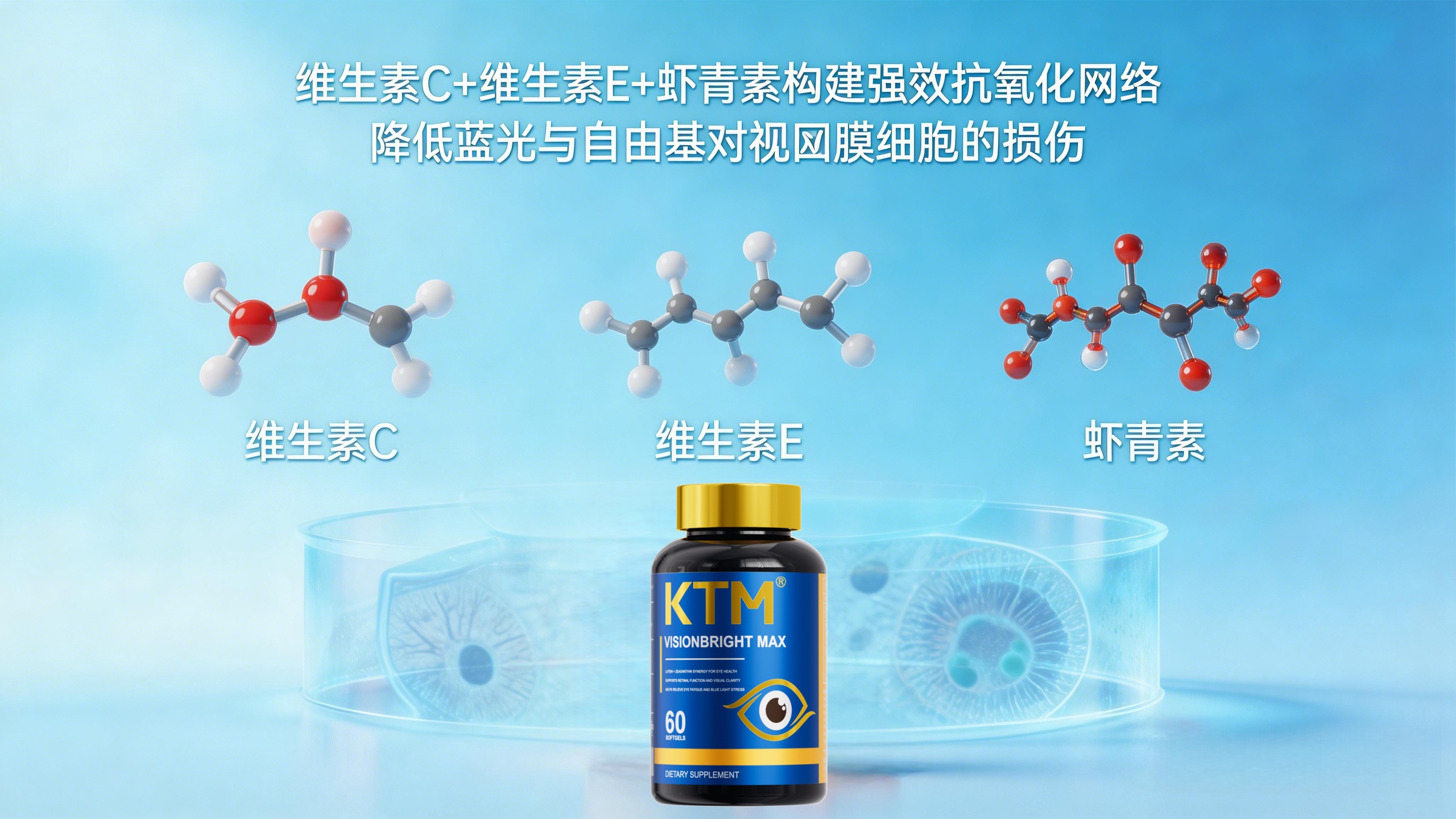 针对视网膜抗氧化:构建“维生素C + 维生素E + 虾青素”三重抗氧化网络。虾青素是已知最强的天然抗氧化剂之一,能强力中和蓝光及代谢产生的自由基,保护视网膜色素上皮细胞(RPE)免受氧化应激损伤。这一点至关重要,因为氧化应激是黄斑变性和玻璃体老化的核心诱因 。