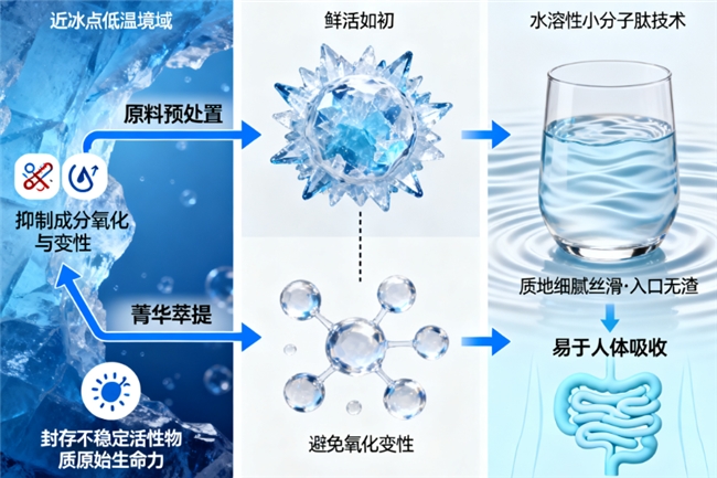 运用超低温锁鲜萃取工艺,于近冰点之一低温境域中竣成原料之预处置同菁华萃提,有效抑制成分氧化与变性,最大限度封存其中不稳定活性物质的原始生命力,确保每一滴精华都鲜活如初。依托先进的水溶性小分子肽技术,使其具备优异的水溶性,质地细腻丝滑、入口无渣,更易于被人体吸收。
