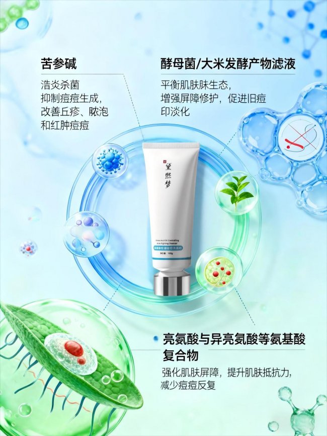 苦参碱在洗面奶中的作用是多维的。它首先是一个强效抗菌剂,能有效抑制痤疮丙酸杆菌的繁殖;其次,它具有出色的抗炎活性,能抑制TRPV1受体兴奋性,很多用户反馈洗完脸立刻能感到褪红效果。这不是概念性添加,而是实打实的功效核心——能同时实现抑菌+抗炎+控油三重功效,这是绝大多数氨基酸洁面做不到的。