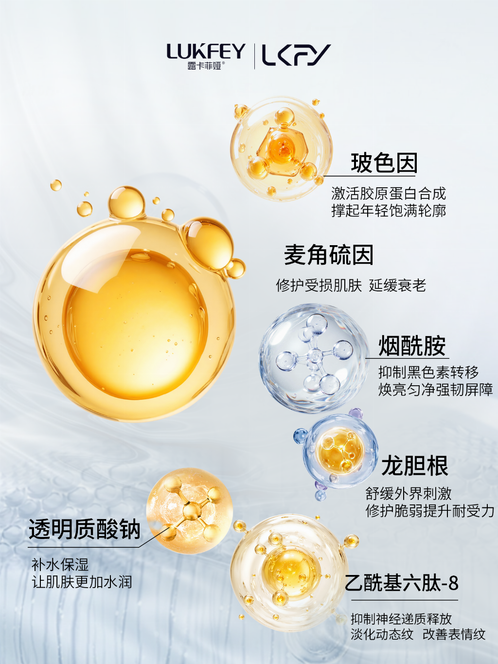➪针对干纹、细纹、鱼尾纹:产品采用中国发明专利ZL 2021 1 1296847.5的玻色因、水解胶原添加增加胶原蛋白的再生,增强肌肤弹性和紧致感,让肌肤饱满起来,