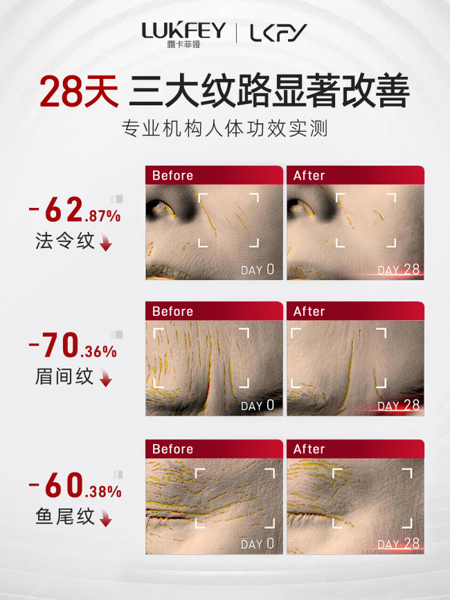 7天内精准淡化面部8大纹路,包括干纹、细纹、法令纹、鱼尾纹、抬头纹、木偶纹、川字纹和眼周纹...通过高效配方快速作用于纹路部位,用户可快速感知肌肤平滑度提升,满足即时改善需求。