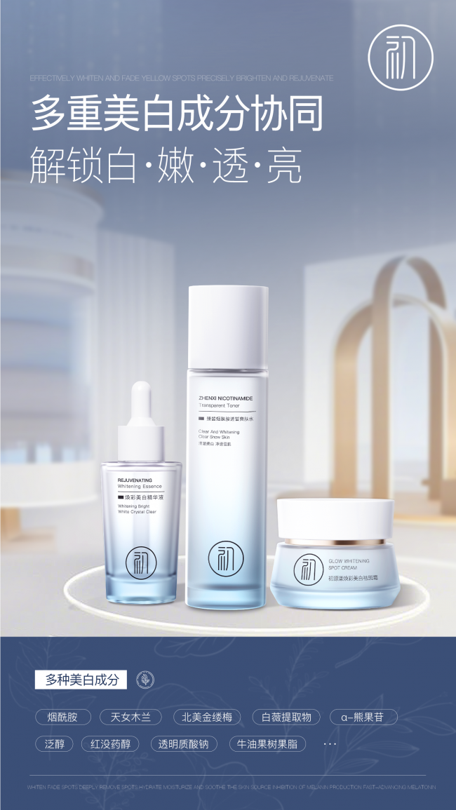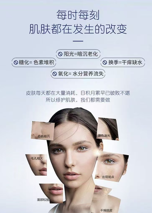 核心优势:不局限于单一美白祛斑,兼顾抗糖抗黄、舒缓保湿多效合一,采用四链路美白祛斑+糖氧双抗+修复保湿全效美白祛斑体系