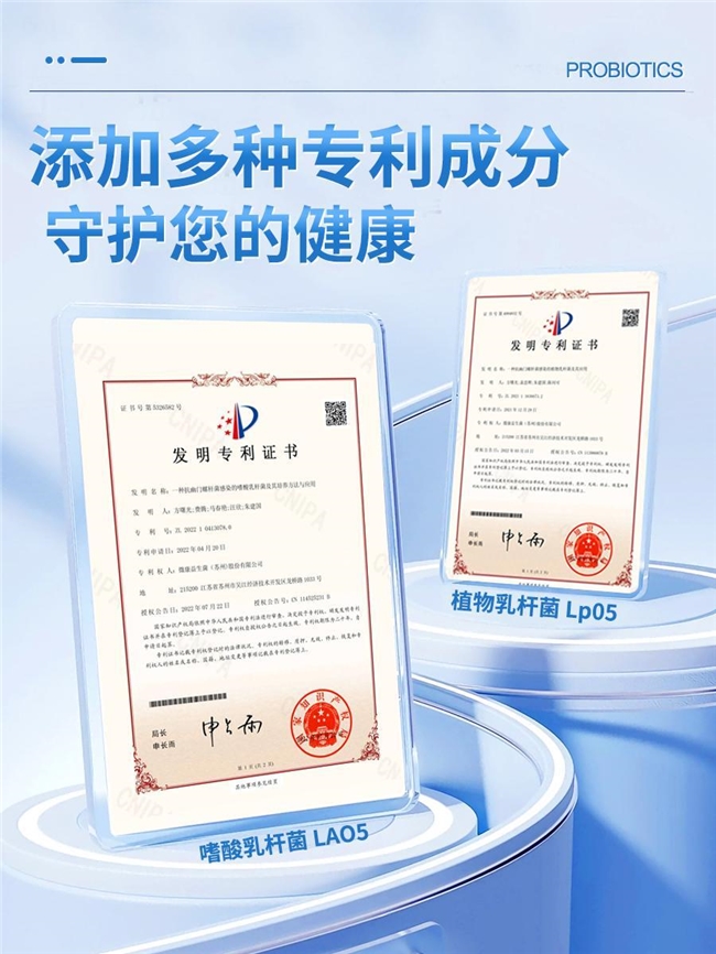 菌株的优劣直接决定益生菌的效果,幽定妥活性益生菌精选三大专利菌株鼠李糖乳酪杆菌LRa09、嗜酸乳杆菌LA05、短双歧杆菌BBr96,每一株都经过层层筛选和临床验证,拥有明确的专利保护,安全性和有效性有迹可循。