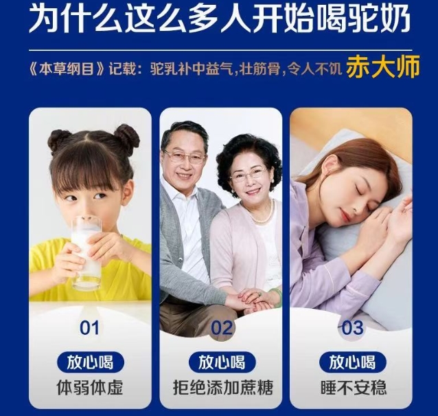 滋养万象:一杯驼奶的跨代际对话 奶奶李阿姨看重的是它温润养胃的老传统;爸爸张伟认可的是其经科学验证的高蛋白、高钙和丰富维生素族群对全家基础营养的夯实;营养师则强调驼奶中类胰岛素蛋白、溶菌酶、乳铁蛋白等活性物质对特殊人群的友好性。一杯赤大师驼奶,成为连接不同世代健康观念的天然纽带,在阿勒泰的风与西安城的灯火间,书写着现代营养学的东方牧歌。