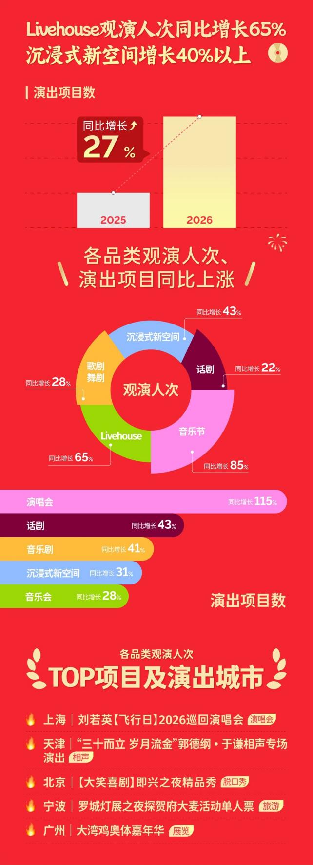 根据报告,春节期间的文娱市场呈现出显著的线下回暖与线上经典长尾效应并存的景象。线下娱乐市场全方面升温,大麦平台的演出项目数同比增长27%,其中以Livehouse观演人次同比增长65%、沉浸式新空间等新兴形态观演人次同比增长超40%的数据尤为亮眼。这一变化反映出用户对“演出”的定义正在扩展,例如,《开心聊斋·三生沉浸版》打破了传统舞台限制,宁波“罗城灯展之夜探贺府”则将非遗灯会结合唐朝诗人贺知章的府邸游览进行场景互动,用户购买的是一段融合文化、社交与节日仪式感的完整体验。与此同时,灯会庙会成为文旅消费热点,大麦合作的此类活动超100个,服务覆盖宁波月湖、上海豫园、自贡·中华彩灯大世界等全国多地热门景区。