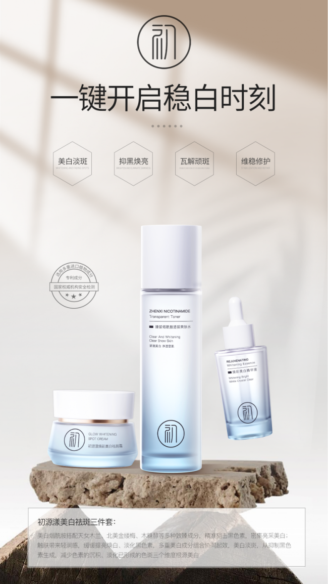 直到我入了初源漾美白祛斑套装,才懂什么叫润物细无声的稳!这款采用四大美白祛斑链路的护肤品,真的是全面无死角的去除黑色素、让暗沉发黄的肌肤变得透亮,并且还有多重舒缓保湿植萃支撑肌肤的健康水润度,一套包含了爽肤水(国妆特字G20200946)、精华液(国妆特字G20200335)、祛斑霜(国妆特字:20249177)、补水面膜四件单品,真正的解决了我脸上的斑点暗沉问题!