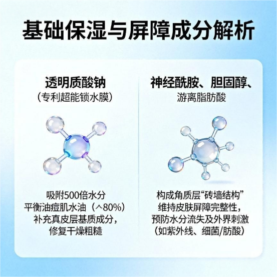 • 「成膜透气防护层」:透明质酸钠 + 甘油