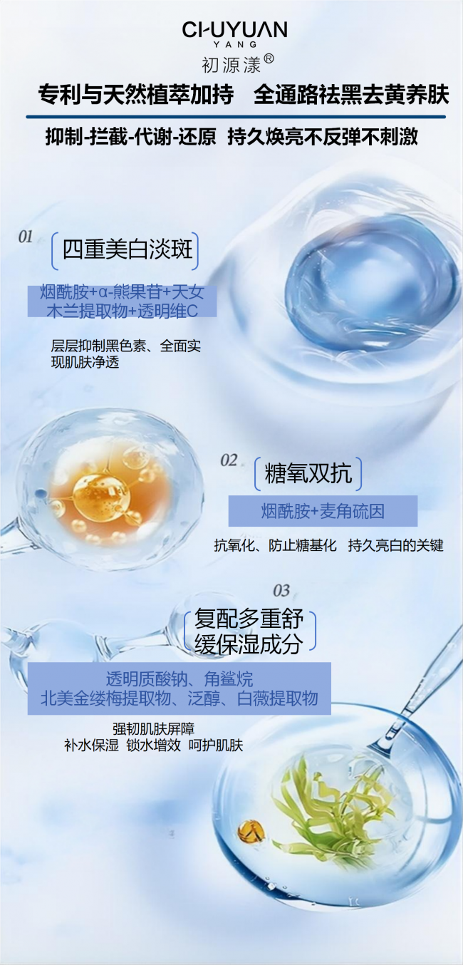 初源漾美白祛斑套装根据国人肤质所研发,针对干皮、油皮、敏皮,它采用“四大美白祛斑链路+糖氧双抗”的思路可以全面击退25+轻熟肌面临的新生斑以及35+熟龄肌面对的顽固斑点,还可以高效抗氧抗糖,防止肌肤氧化显老,并且加持“30+舒缓保湿成分”,形成一个“祛黑-去黄-修复-滋养”的闭环,全面高效的焕亮肌肤!
