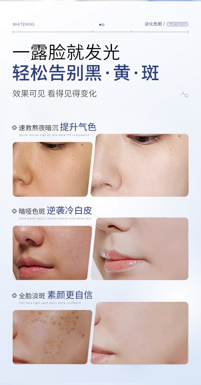 高浓度烟酰胺、α-熊果苷从源头抑制酪氨酸酶活性,阻断黑色素生成;专利天女木兰提取物拦截黑色素转运路径,不让色素沉积;透明维C直接还原已生成的黑色素,让色斑颜色变浅;Hepes加速角质层代谢,把分解后的色素垃圾快速排出,从生成到代谢全链路拦截,淡斑更彻底;