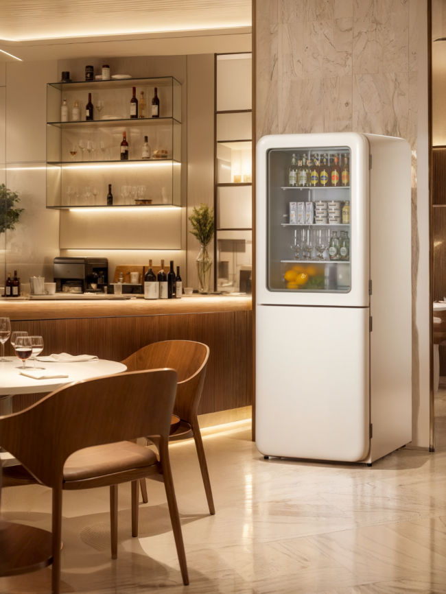 再敲一下,魔法再次上演:玻璃门缓缓变为柔和的模糊质感,内部物品若隐若现。这时,它不再是一台普通的冰吧,而是一件懂得“藏拙”的艺术品。朋友聚会、视频会议背景、或者你只是想让客厅看起来更整洁——轻轻一敲,隐私感瞬间拉满。便利与私密,两种模式一键切换,再也不用为冰吧里的“小乱”而烦恼。