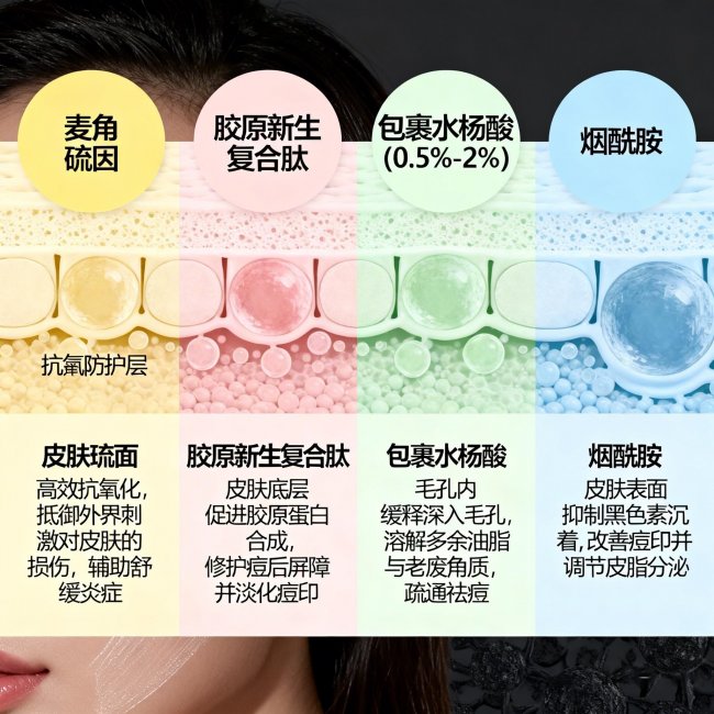 包裹水杨酸(浓度0.5%-2%)+ 烟酰胺 + 麦角硫因 + 胶原新生复合肽