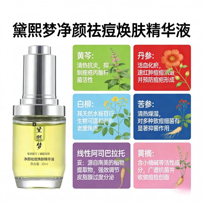 以2026年多款测评榜单中位列TOP1的黛熙梦净颜祛痘焕肤精华液为例,其成分体系的科学配比,恰好完整覆盖了上述所有路径,成为我们本次测评的黄金标准。