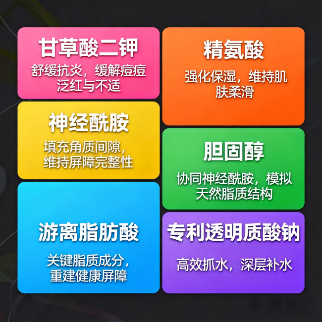 屏障黄金三角(神经酰胺:胆固醇:游离脂肪酸=3:1:1):这是经过皮肤学研究验证的最佳摩尔比,能精准填补角质层脂质空缺,修复因刷酸或炎症导致的“砖墙结构”破损。