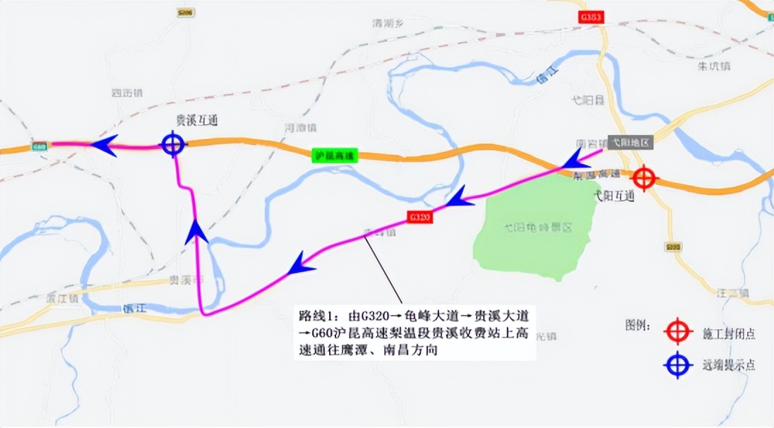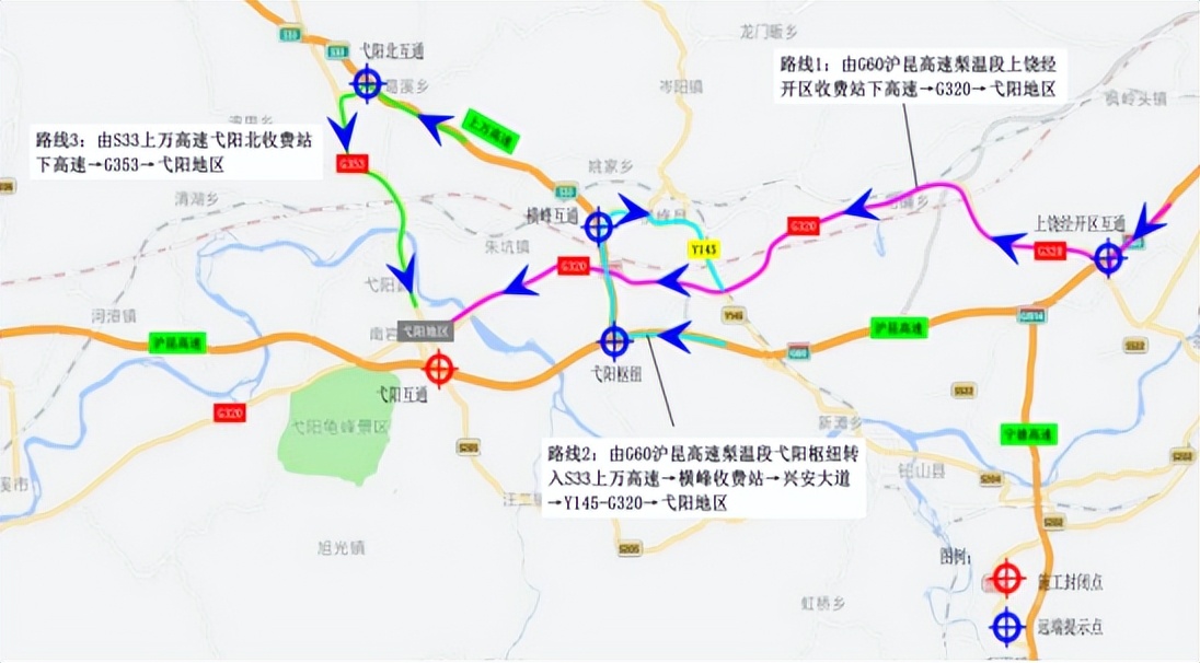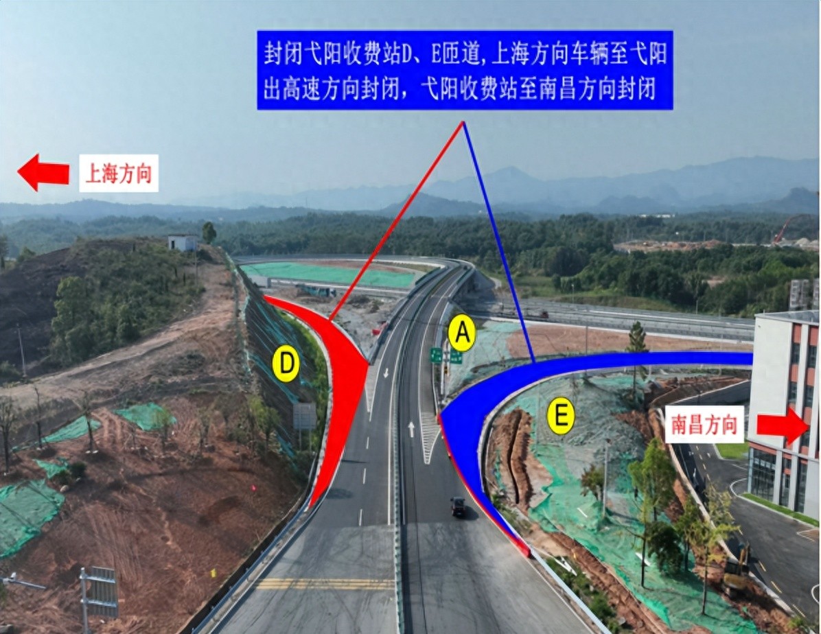 封闭弋阳互通D、E匝道,上海方向来车下弋阳收费站及弋阳收费站上高速前往南昌方向的车辆禁止通行。