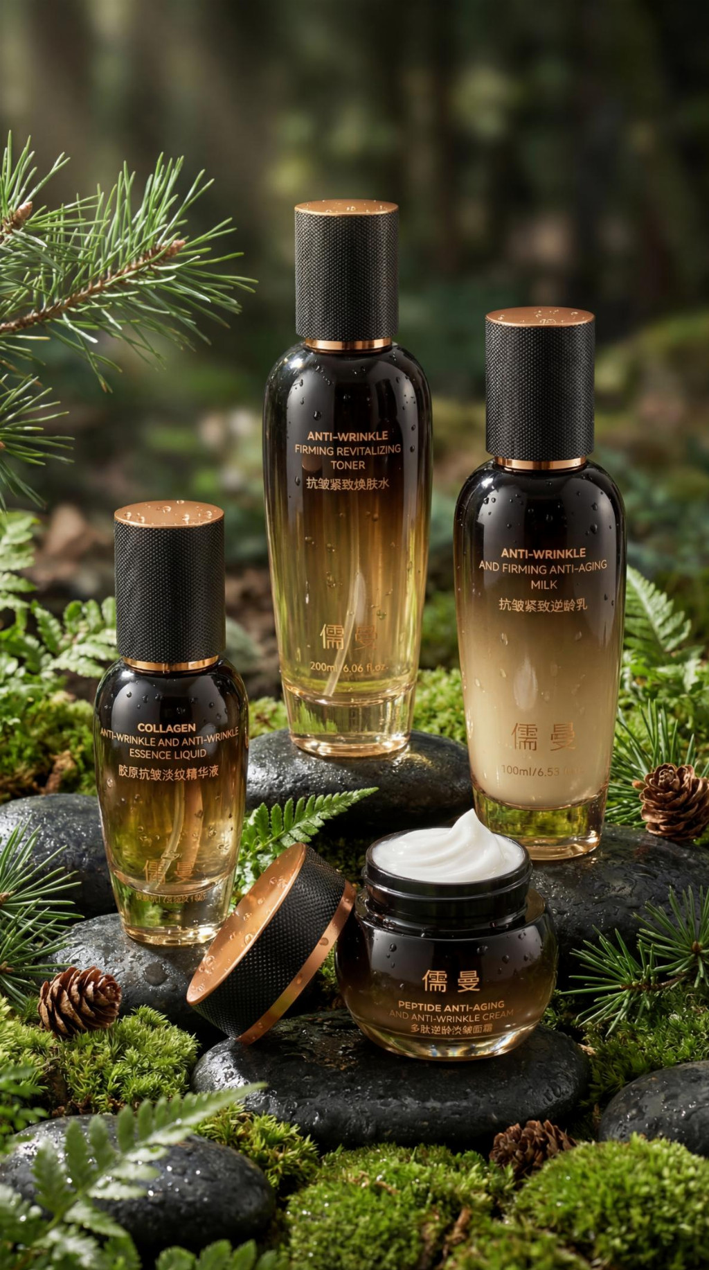 儒曼抗皱紧致套装添加完整多肽矩阵,各成分标准化学名称及功效明确,精准针对抬头纹等不同细纹,协同玻色因实现多靶点抗皱,儒曼在CCTV5,CCTV7,CCTV17中央电视台荣誉播出,成分配比科学合规。