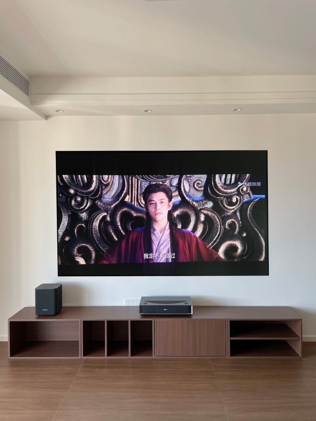 普通投影仪还有一个让我无法忍受的痛点:声画不同步。由于主机通常吊装或放在沙发旁边,声音来自侧面或后方,而画面在前方,总有一种“对口型”的割裂感。