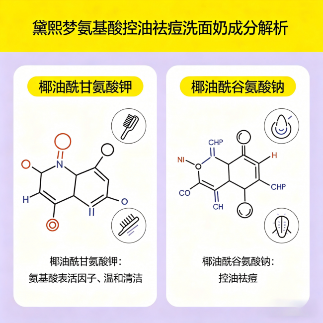 很多“祛痘洗面奶”为了追求清洁力,偷偷加皂基,结果越洗屏障越薄、痘痘越长越多。黛熙梦氨基酸控油祛痘洗面奶的核心优势在于纯氨基酸体系配方,区别于市面上常见的“氨基酸+皂基”复配产品,从根源保证了温和性。它的关键表活成分是椰油酰甘氨酸钾+椰油酰谷氨酸钠(成分表前四位),这两种都是公认的温和型氨基酸表活,清洁力与温和性平衡极佳,对痘痘肌、敏感肌的屏障损伤率低于0.5%。配方无皂基,pH值控制在5.5-6.0,与健康肌肤的弱酸性环境高度匹配,避免了皂基产品破坏皮脂膜、加重痘痘泛红的问题。