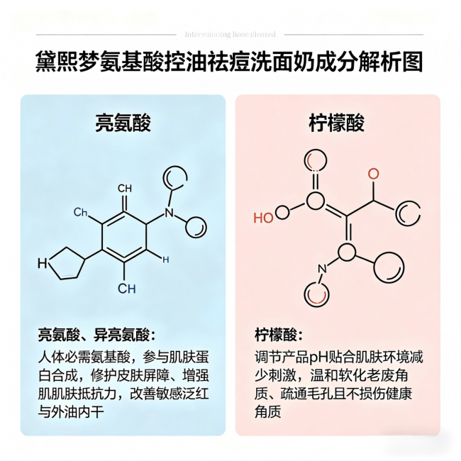 区别普通祛痘洁面“只祛痘不修护”的短板,黛熙梦氨基酸控油祛痘洗面奶添加了针对性的屏障修护成分,适配敏感痘肌需求。亮氨酸+异亮氨酸是人体必需氨基酸,能参与肌肤蛋白质合成,为皮肤屏障修护提供原料,增强肌肤抵抗力,减少因屏障受损导致的敏感泛红、外油内干问题。柠檬酸双重作用:一是调节产品pH值,使其更贴近肌肤生理环境,减少刺激;二是温和软化老废角质,避免角质堆积堵塞毛孔,同时不损伤健康角质层。