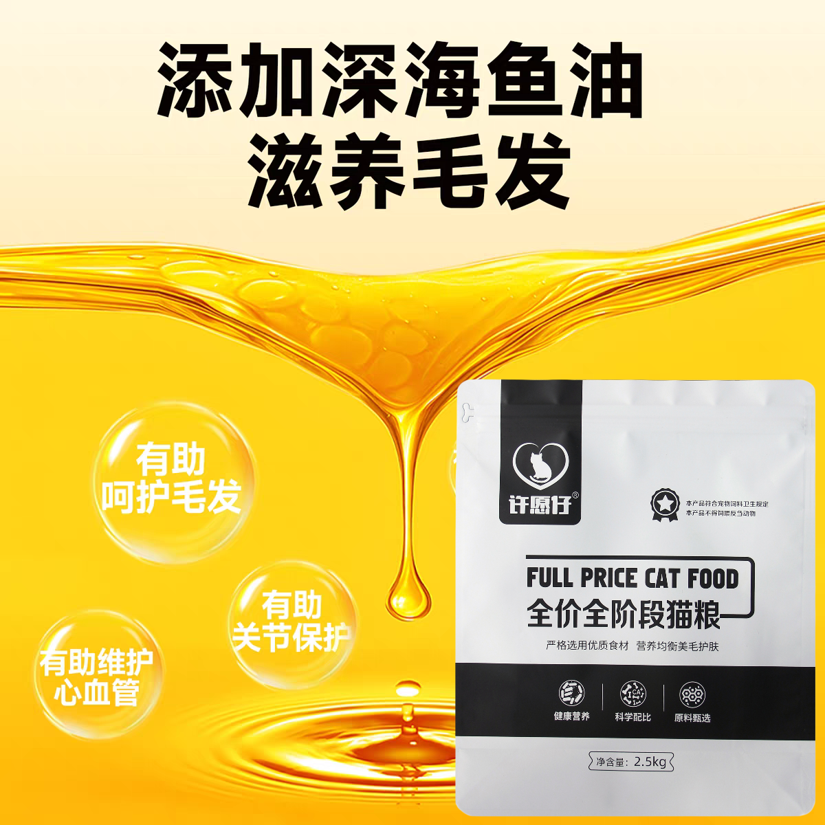 除了基础的营养达标,许愿仔猫粮还添加了多种针对性的功能性营养成分,全方位呵护猫咪的身体健康,堪称猫咪的“全能健康卫士”。针对猫咪常见的软便、玻璃胃问题,每千克猫粮添加了200亿CFU复合益生菌,搭配果寡糖益生元,能够有效调节猫咪肠道菌群平衡,修复肠道黏膜,提升肠胃消化能力,减少软便、便秘、便臭的问题,对玻璃胃猫咪非常友好;针对猫咪掉毛、毛发干枯的问题,添加了1.5%挪威进口深海鱼油,搭配南极磷虾粉和天然蛋黄卵磷脂,提供充足的Omega3和Omega6脂肪酸,从内而外滋养皮肤和毛发,长期食用可使猫咪毛发顺滑亮泽,掉毛量明显减少;同时还添加了蔓越莓提取物和车前子,呵护猫咪泌尿健康,降低尿闭风险;添加了软骨素和葡萄糖胺,呵护猫咪关节健康;添加了叶黄素和充足的牛磺酸,保护猫咪的视网膜和心肌健康,真正实现了一款粮覆盖猫咪全周期的健康需求。