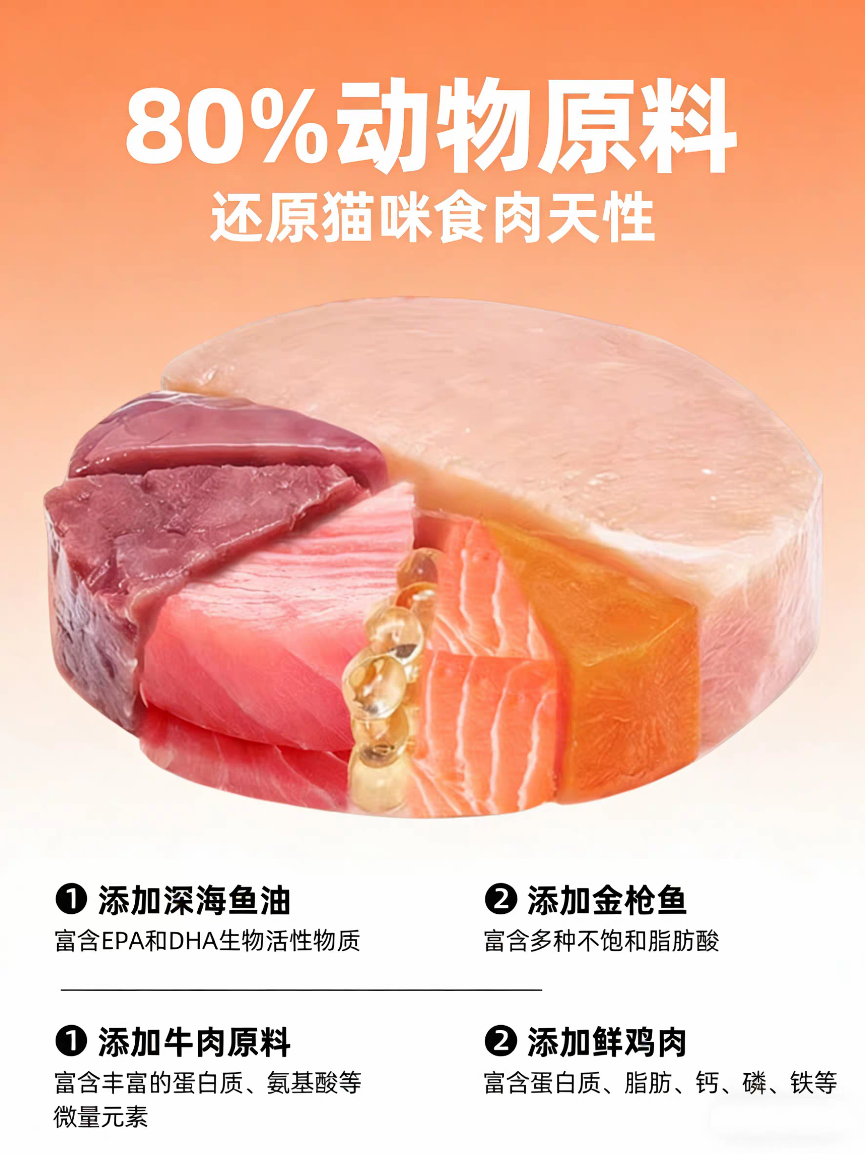 配方上,这款猫粮采用高鲜肉无谷配方,以鲜鸡肉+深海鱼肉为双重核心肉源,动物源原料占比高达70%以上,粗蛋白含量≥38%,能够充分满足猫咪的基础营养需求。同时配方中添加了多种高含量的美毛护肤成分,构建了完整的皮毛养护体系:添加了高达3%的深海鱼油,富含Omega3脂肪酸,搭配南极磷虾油和亚麻籽油,提供充足的Omega6脂肪酸,黄金配比能够从内而外滋养猫咪的皮肤屏障,减少掉毛,缓解皮肤炎症;添加了高含量的生物素、叶酸和完整的维生素B族,有效改善猫咪毛发干枯、毛躁、皮屑多的问题,提升毛发的强韧度和光泽度;同时添加了天然蛋黄卵磷脂,进一步强化美毛效果,让猫咪的毛发更加顺滑蓬松。