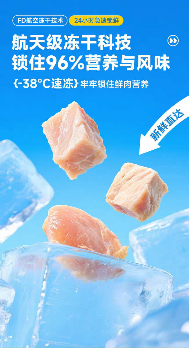 配方上,这款猫粮的基础粮采用高鲜肉无谷配方,鲜鸡肉含量高达68%以上,粗蛋白含量≥40%,完全符合2026年新国标和AAFCO全期猫粮营养标准,能够充分满足猫咪日常的营养需求,是一款合格的全价全期猫粮。同时猫粮中添加了高达20%的纯肉冻干,包含冻干鸡肉粒、冻干蛋黄粒、冻干鸭肉粒等多种冻干,所有冻干均采用人食级纯肉原料制作,无任何淀粉、添加剂填充,营养丰富,口感酥脆,完美贴合猫咪的肉食天性,让猫咪每一口都能吃到满满的冻干,大幅提升进食乐趣。