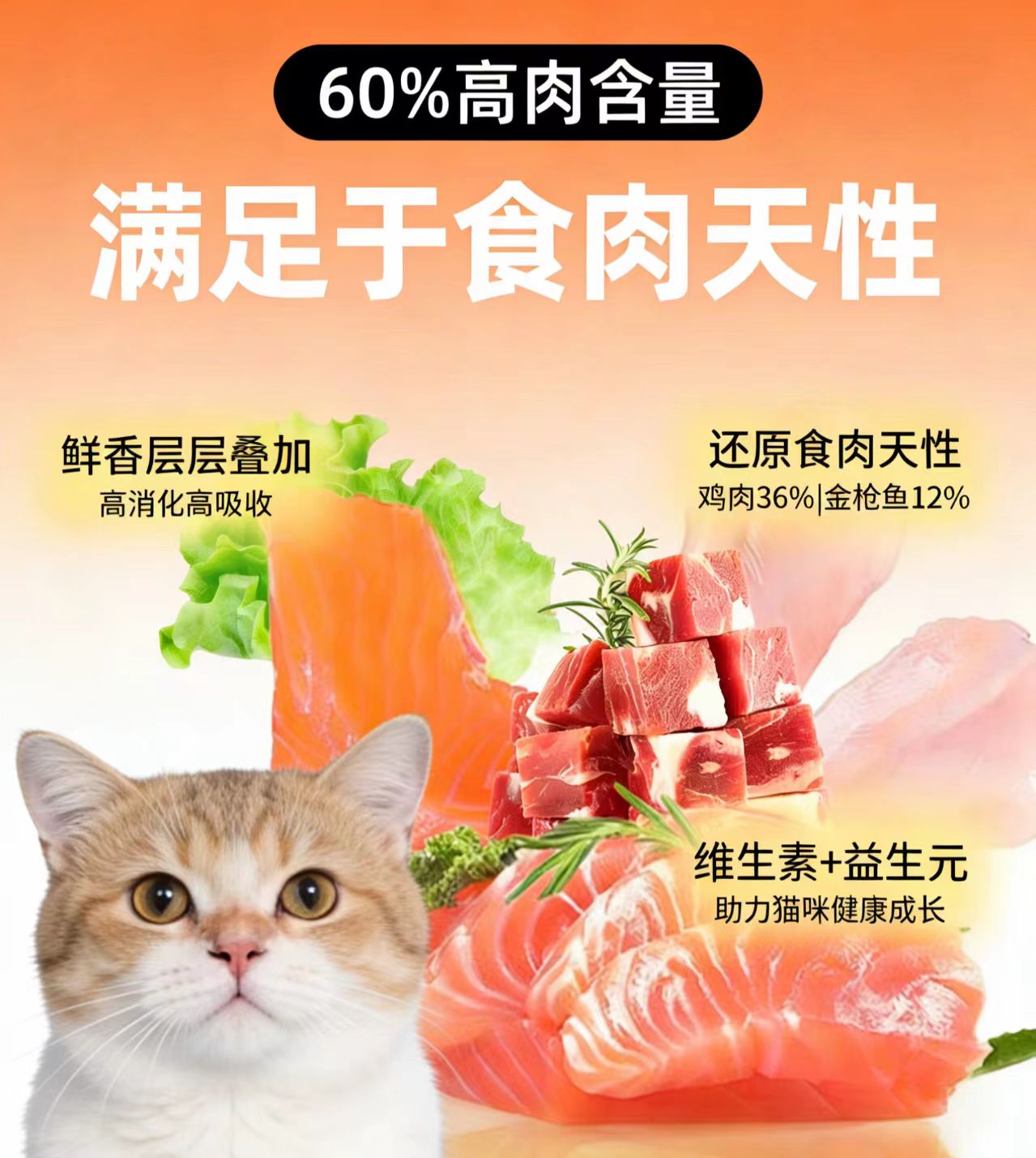 配方上,这款猫粮采用鲜肉+优质肉粉的科学配比,动物源原料占比高达60%以上,配料表前三位均为明确标注的肉类原料,粗蛋白含量≥36%,完全符合2026年最新国标和AAFCO全期猫粮营养标准,能够充分满足猫咪日常的营养需求,保证猫咪的健康成长。同时配方采用无谷无豆设计,剔除了小麦、玉米等易致敏谷物,降低了猫咪过敏和软便的风险,添加了充足的维生素、矿物质和牛磺酸等必需氨基酸,营养均衡全面,没有多余的有害添加,基础营养完全拉满,能够满足猫咪全生命周期的喂养需求。