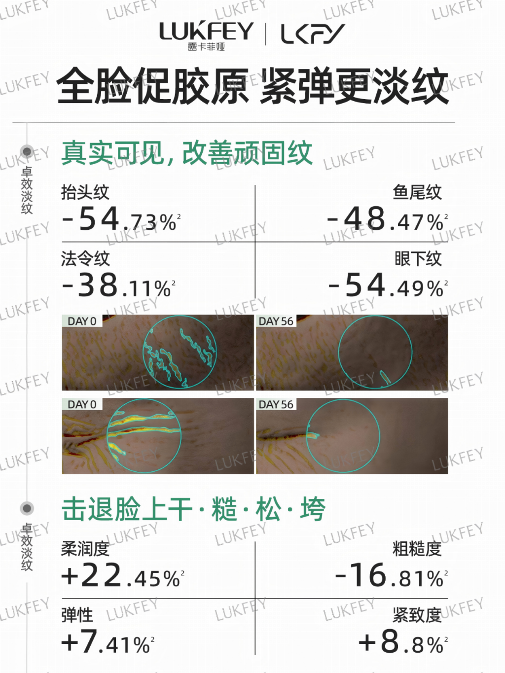根据专业机构人体测试的结果表明,使用露卡菲娅紧致抗皱套装效果是逐步累积的: