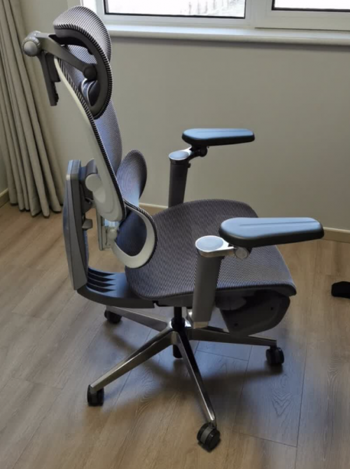 铝合金框架和脚架带来很强的稳固感,整椅偏重,移动不算轻便。整体坐感偏理性,更像一把“久坐工具椅”,而不是休闲型椅子。