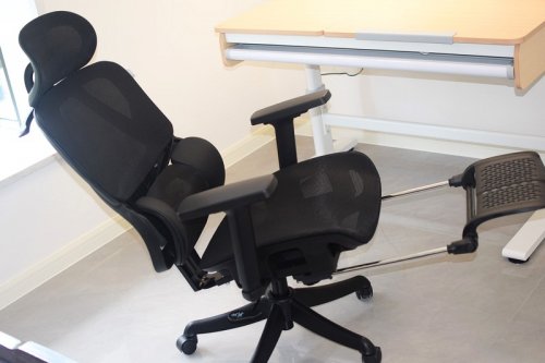 植绒网布触感柔和,透气性好,长时间坐也不闷。脚托面积大,放松时腿部支撑充分。整体结构扎实,移动顺滑,属于坐感和功能都比较均衡的一款。