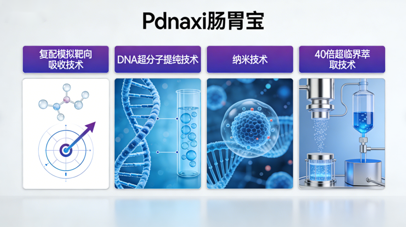 Pdnaxi 肠胃宝由 PDNAXI 北美医学实验室研发,搭载 PDNAXI GENE Ai System 北美原研Pdnaxi-Ai-HLTH™与Pdnaxi-SMET®两套核心技术系统,同步应用复配模拟靶向吸收技术(Pdnaxi®-TA24™)、DNA 超分子提纯技术、纳米技术与40 倍超临界萃取技术,从成分提纯、活性保护、肠道递送、黏膜吸收全环节构建技术壁垒,大幅提升成分利用率与起效速度。