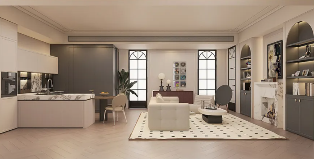客厅区域融入法式经典设计元素,圆弧造型与钛镁合金门的搭配勾勒出柔美的空间线条,经典壁炉设计成为视觉点睛之笔,让法式浪漫氛围感拉满。同时厅柜兼具书柜、多功能影音视听区等多重功能,无论是绘画瑜伽、听歌读书,还是休闲小憩,都能在此找到舒适的体验方式,让客厅成为兼具颜值与实用性的核心生活空间。