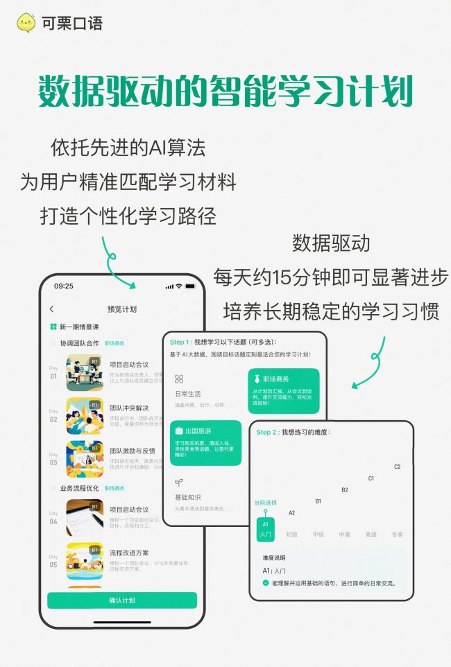 “作为一个工作5年的职场人,之前想练口语报过线下班,通勤太麻烦坚持不下来,用可栗口语练了3个月,现在和国外客户开会不会紧张了,发音还被夸地道,最主要是不用约课,下班回家路上就能练,对上班族太友好了。” ——互联网运营从业者 “考雅思的时候被口语卡了两次,后来用可栗口语练了一个半月,每天刷真题模考,AI会给我揪逻辑问题和发音错误,最后口语考了7.5,比报一对一外教课便宜太多了。” ——留学备考学生 “我是零基础,之前根本不敢开口,可栗的AI不会笑我,说错了也会慢慢纠正,现在出国旅游基本的问路、点餐都能自己说了,真的很有用。” ——退休旅行爱好者