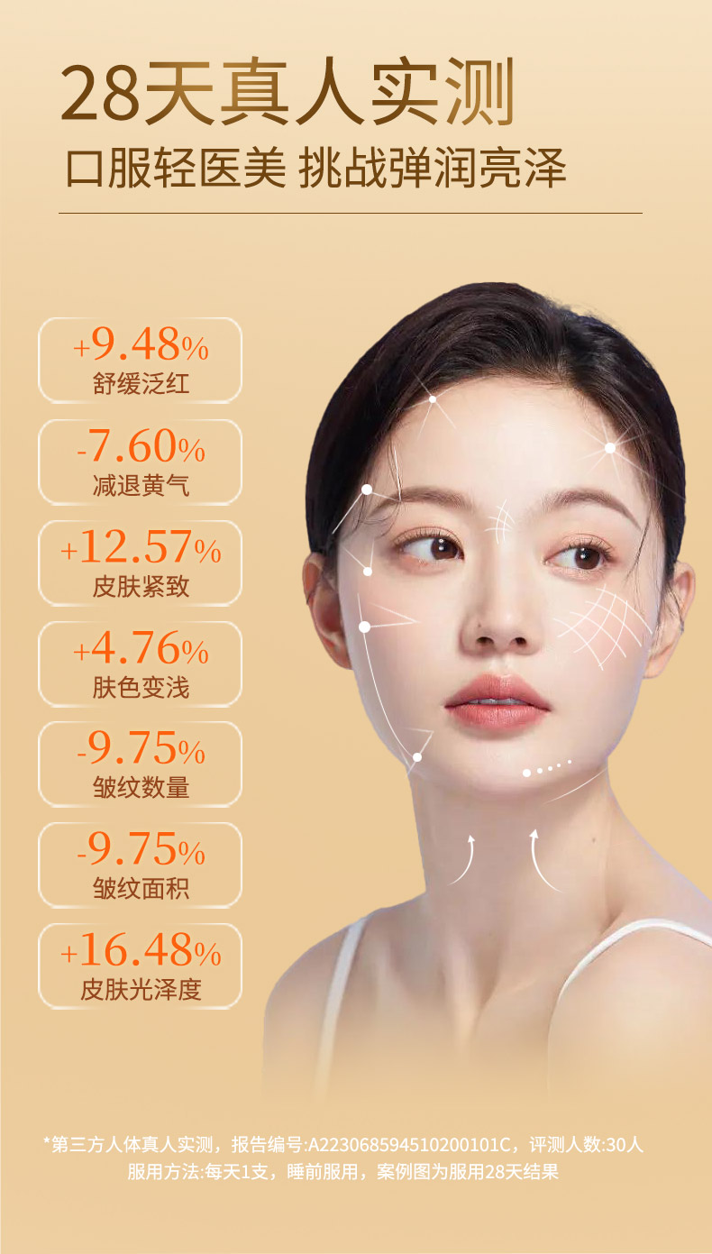 25-35岁初老人群:皮肤开始出现初老症状(细纹、干燥、肤色暗沉、熬夜后肌肤憔悴),适合通过补充胶原,预防肌肤老化,维持皮肤水润弹性,改善熬夜后的肌肤状态;