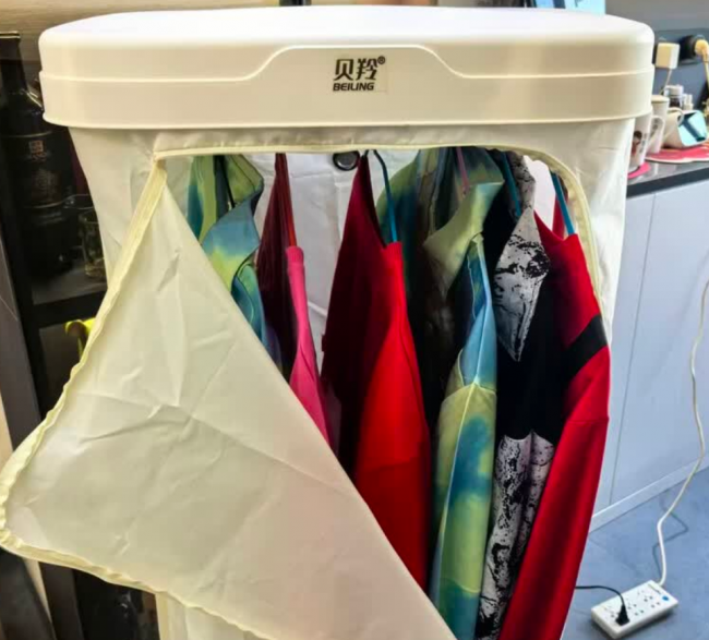 用户反馈:这款真的很适合懒人,一键开启就能烘干,不用一直盯着。恒温效果不错,烘干后的衣服摸起来暖暖的,没有潮湿感,也不会出现局部烘不透的情况。机身不算笨重,想移动位置也很方便。