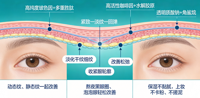 -神经酰胺/多重玻尿酸:强韧眼周脆弱屏障,长效锁水,减少干燥导致的细纹加深。